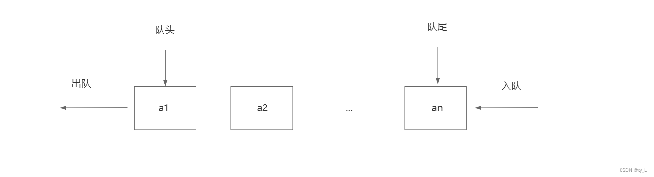 数据关系:R = {<ai-1,ai> | ai-1,ai ∈ D, i = 2, 3, ..., n} //约定a1端为队头,an端为队尾