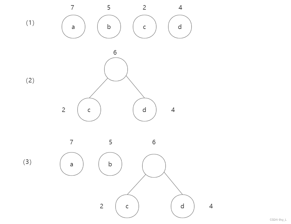 例如:有4个结点a、b、c、d,权值分别为7、5、2、4,构造哈夫曼树。