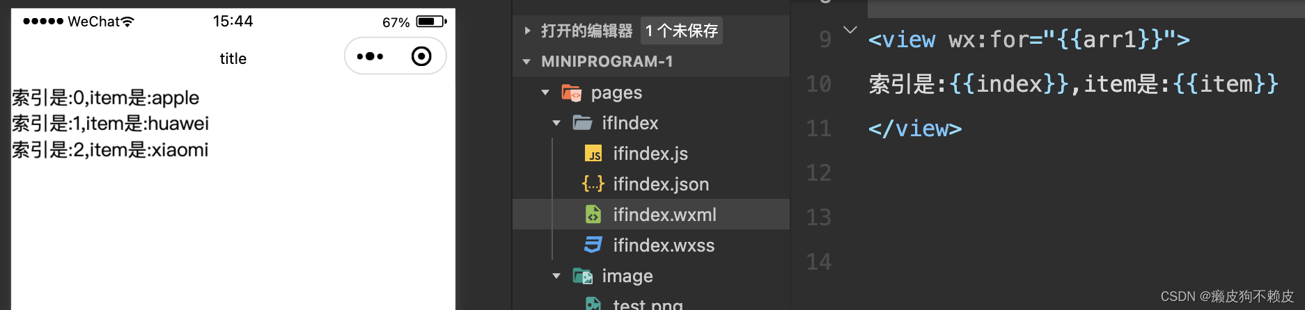 - 使用 wx:for-index 可以指定当前循环项的索引的变量名