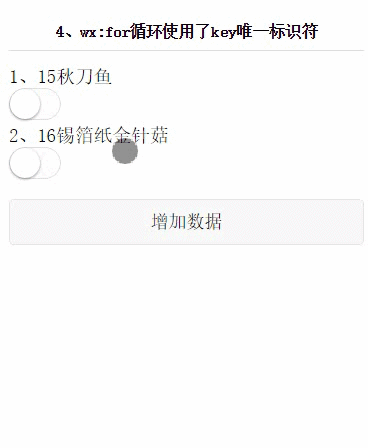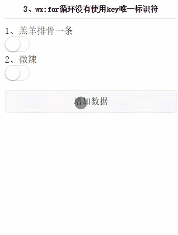 举个例子,现在有个点击按钮勾选的例子,当我们勾选羔羊排骨一条,点击增加数据后,羔羊排骨左侧的被选中状态按理来说是应该一直跟随羔羊排骨的,但是我们可以发现被选中按钮并没有跟随羔羊排骨变化,而是哪个数据是第一个哪个数据就是被选中状态,这就是因为我们在写for循环时没有添加wx:key没有给定数据一个唯一的标识导致算法无法固定原有数据的渲染。