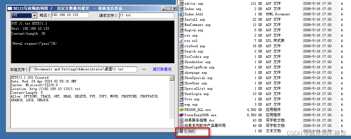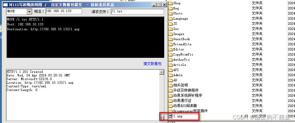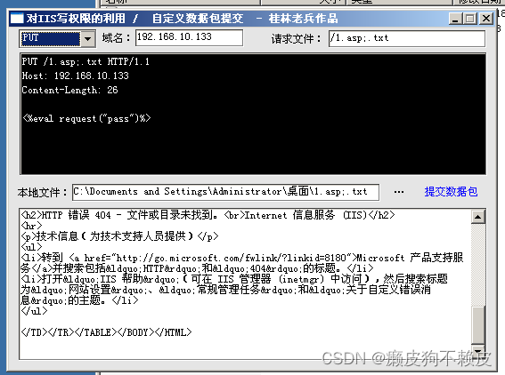 IIS6.0 server在web服务扩展中开启了WebDAV(Web-based Distributed Authoring and Versioning)。WebDAV是一种HTTP1.1的扩展协议。它扩展了HTTP 1.1,在GET、POST、HEAD等几个HTTP标准方法以外添加了一些新的方法,如PUT,使应用程序可对Web Server直接读写,并支持写文件锁定(Locking)及解锁(Unlock),还可以支持文件的版本控制。可以像在操作本地文件夹一样操作服务器上的文件夹,该扩展也存在缺陷,利用PUT方法可直接向服务器上传恶意文件,控制服务器
