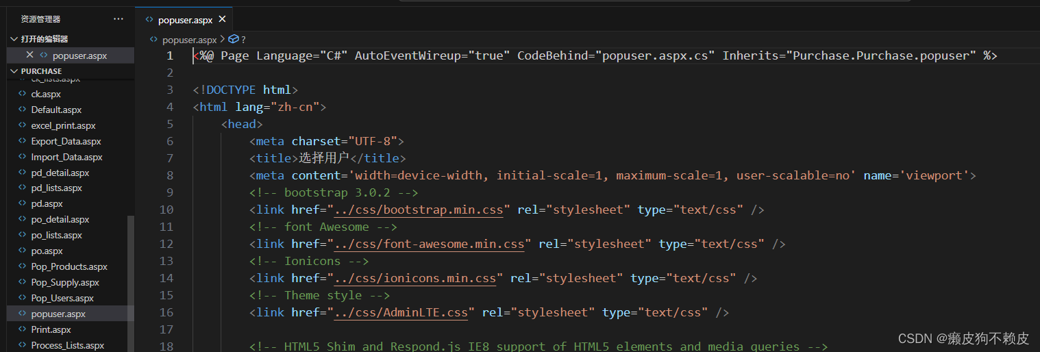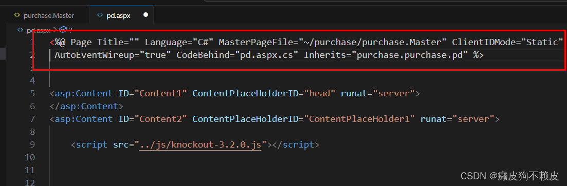 打开pd.aspx源文件,并没有看到验证代码,但可以看到有一个母版路径purchase.Master,CodeBehind指向的后端代码和继承了purchase.pd