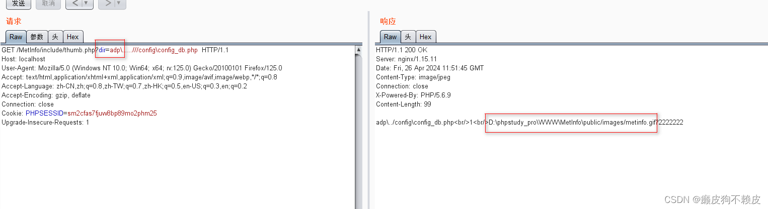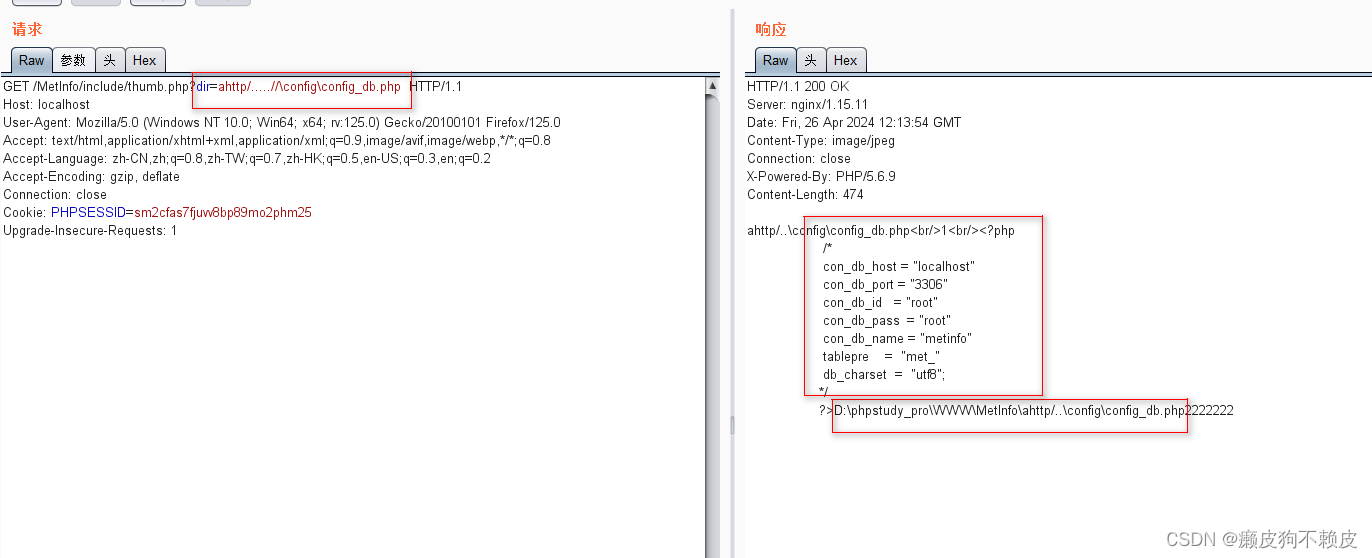 可以看到代码中 if(substr(str_replace($_M['url']['site'], '', $dir),0,4) == 'http' && strpos($dir, './') === false)这个条件用于检测一个路径$dir是否是一个以'http'开头且不是相对于当前目录的(不包含'./')。但是,这样的判断方式并不完全准确,因为它只是检查了前4个字符是否为'http',而没有确保整个字符串是一个有效的URL。同时,检查'./'来排除相对路径的方式也是有限的,因为它没有考虑如'../'或其他相对路径形式。当我们试图构造playload:http://localhost/MetInfo/include/thumb.php?dir=http\.....//\config\config_db.php