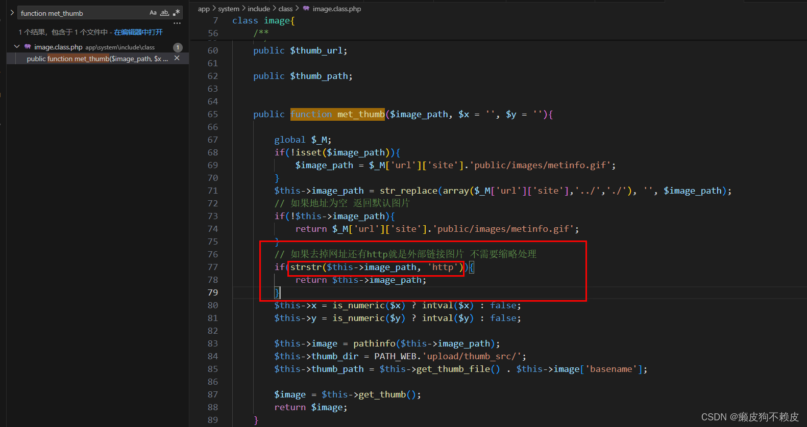 可以看到红框上面的又做了一次../和./的过滤,如果没有http会执行红框下面的代码,在$image = $this->get_thumb();追踪到get_thumb可以看到return file_exists($thumb_path) ? $this->thumb_url : $this->create_thumb();,继续追踪 $this->create_thumb();,可以看到会返回一个默认路径