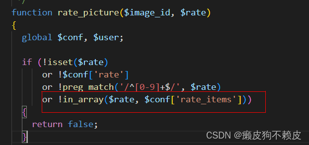 注意在rate_picture方法中对rate的值使用了in_array方法来判断传进来的值是否在$conf['rate_items']中,并且没有加上第三个参数true,也就是说传进来的值不做类型判断,并且会强转来完成in_array的判断