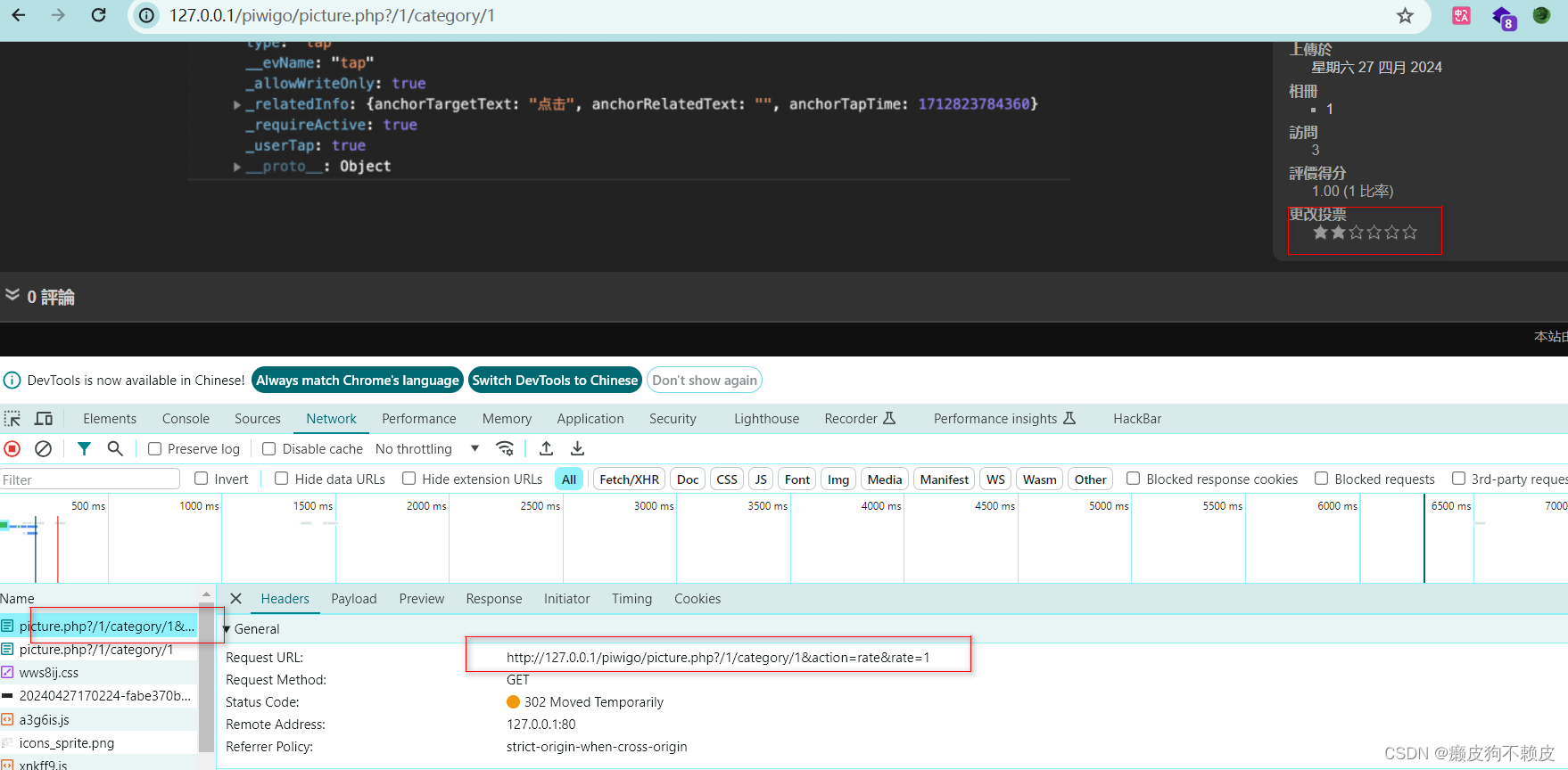 创建一个普通用户,打开照片,确实在点击更改投票时得到了一个传rate的url