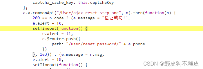 从该代码中,可以看到重置密码时,通过手机发送验证码验证身份,返回为200则表示验证成功,并跳转到修改密码的页面