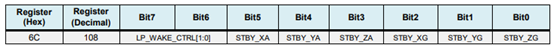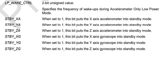 该寄存器的LP_WAKE_CTRL用于控制低功耗时的唤醒频率,剩下的6位,分别控制加速度和陀螺仪的x/y/z轴是否进入待机模式,这里我们全部都不进入待机模式,所以全部设置为0 即可。