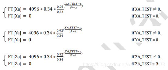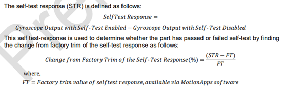 自检测功能是允许用户自己去测试MPU6050的陀螺仪和加速度计的机械电气部分是否正常的一个功能,其中STR是自检测功能开启后设备自己测试的到的一个值,FT是厂家测试的到的一个值,如果6050的响应值相对于厂家测试值的百分比不再范围内(%=(STR-FT)/FT),则说明芯片测的数据不正常