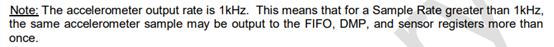 1. Gyroscope Output Rate = 8kHz when the DLPF is disabled (DLPF_CFG = 0 or 7), and 1kHz when the DLPF is enabled;