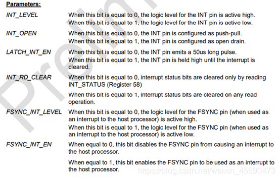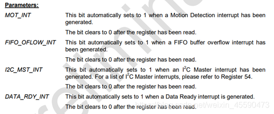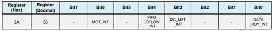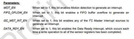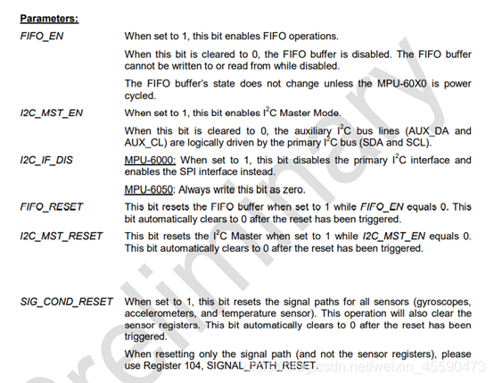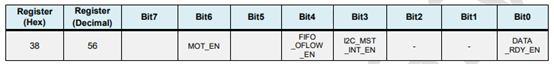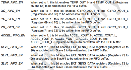 我们这里只关注:ACCEL_FIFO_EN(代表加速度计的数据),ZG_FIFO_EN,XG_FIFO_EN,YG_FIFO_EN,TEMPG_FIFO_EN这几个位,位被置一代表采样得到的相应数据可以先存入FIFO存储器,然后在成段的发动给MCU。