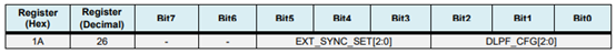 This register configures the external Frame Synchronization (FSYNC) pin sampling and the Digital Low Pass Filter (DLPF) setting for both the gyroscopes and accelerometers.(为陀螺仪和加速度计配置外部帧同步采样引脚FSYNC和DLPF低通滤波器设置)。
