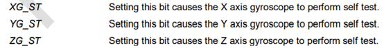 在前面我们提到过自检寄存器,但是自检寄存器中的参数是让我们输入的(我们拿软件测量得到的当前参数),并没有使能器件本身测量的功能,不将器件自身测量值与我们人工测量的至做对比,怎能知道器件是否合格呢?这个寄存器中包含了“使能器件测量角度和加速度并且将自身测量值和我们人工测量的值进行对比”的位: