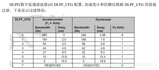 操作0X1A配置寄存器中的DLPF_CFG位可以实现滤波器带宽的设置: