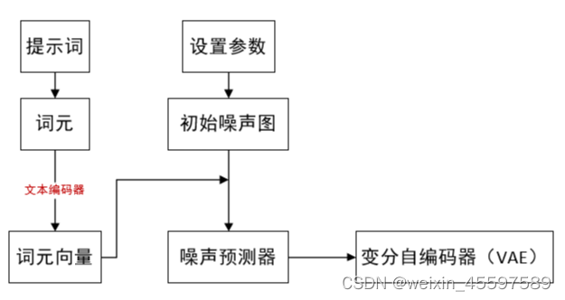 stable diffusion原理简析 提示词———词元——词元向量噪声预测器根据设置参数生成初始噪声图,噪声预测器在文本编码器的指导下,一步步去除噪声经由变分自编码器将生成向量转化为肉眼可分辨的图片模型文本编码器(Text Encoder)、噪声预测器(Noise Predictor)、变分自编码器(Variational Auto Encoder)统称为模型。
