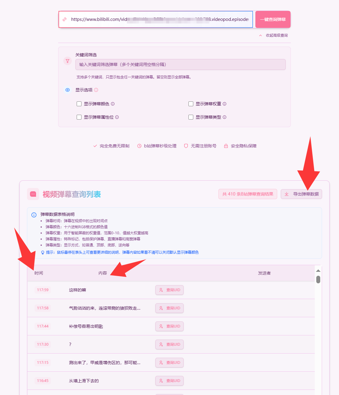 获取全部弹幕,其中,红色箭头指向弹幕,绿色箭头指向的是第一个数字,如7184.42200,是指的本分P视频中该弹幕出现的时刻