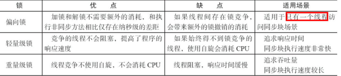 - 偏向锁:无实际竞争,且将来只有第一个申请锁的线程会使用锁。