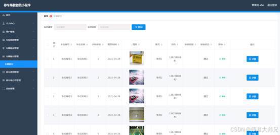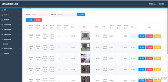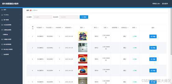 管理员进入指定功能操作区之后可以管理车位信息。其页面见下图。管理员增删改查车位信息,查看车位目前状态是否为空闲状态。
