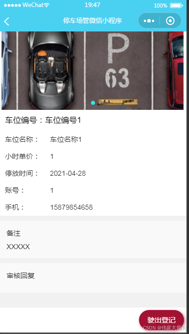 用户进入指定功能操作区之后可以查看车辆停放信息。其页面见下图。用户查看车辆停放,查看管理员审核信息,可以点击页面右下角的驶出登记按钮登记车辆驶出信息。
