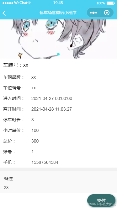 用户进入指定功能操作区之后可以查看停车费用信息。其页面见下图。用户查看停车费用信息,对停车费用进行支付。