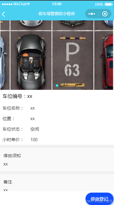 用户进入指定功能操作区之后可以查看车位信息。其页面见下图。用户查看车位信息,可以在页面右下角点击停放登记按钮登记车辆停放信息。