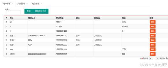 展示用户医护人员的个人信息、对用户进行列表查询、添加以及删除操作