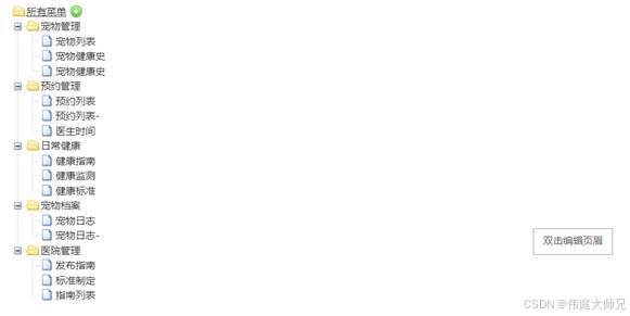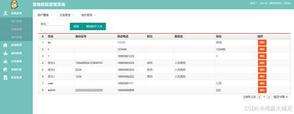 登录后进入系统首页,主要模块有:用户模块管理、页面模块管理、角色模块管理、宠物列表模块管理、宠物健康历史、预约模块管理、医生日期模块管理、宠物日常健康模块管理、医院信息管理和注销退出等具体功能、每个模块有对应的功能、比如:添加、修改、删除、等功能设置