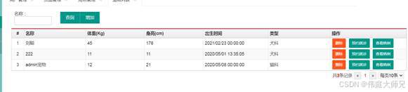 点击看查看宠物列表信息、体重、身高、类型、也可以对列表信息进行修改删除操作。