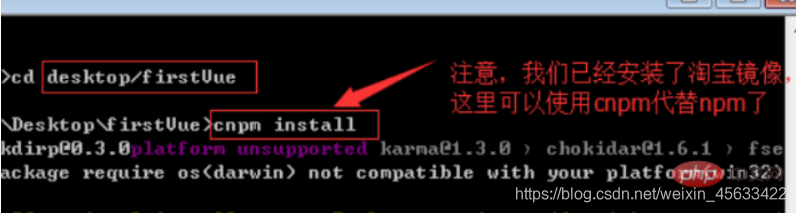 安装依赖包,首先cd到项目文件夹(firstVue文件夹),然后运行命令 cnpm install ,等待安装