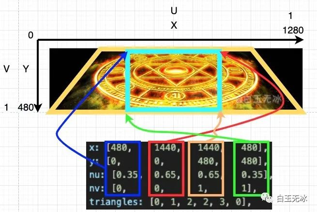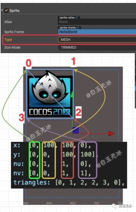 Sprite 组件的渲染模式 Mesh 的坐标轴是左上角,位置坐标 xy 范围是图片大小,纹理坐标 uv 范围是 0-1 。