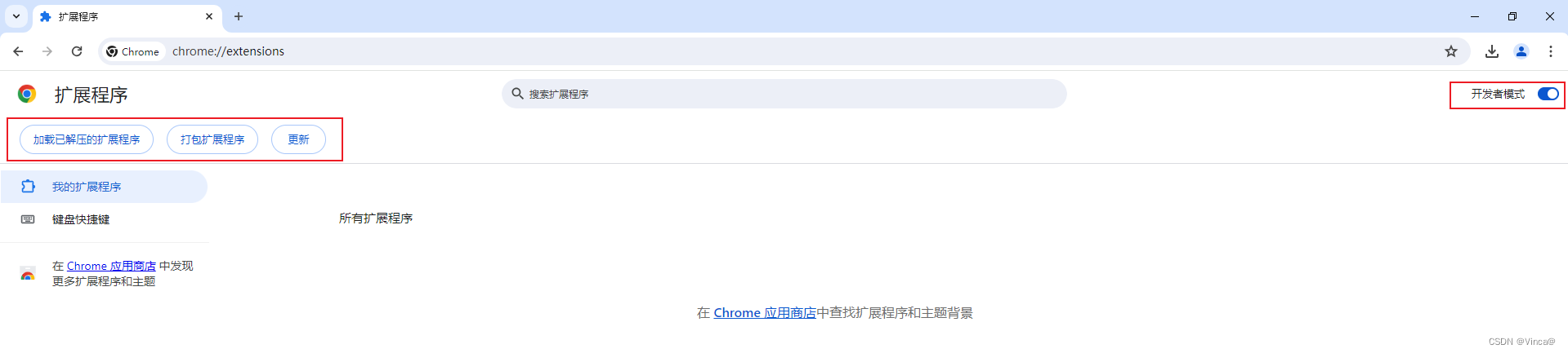 打开之后,会出现如下图的三个按钮:加载已解压的扩展程序、打包扩展程序、更新。