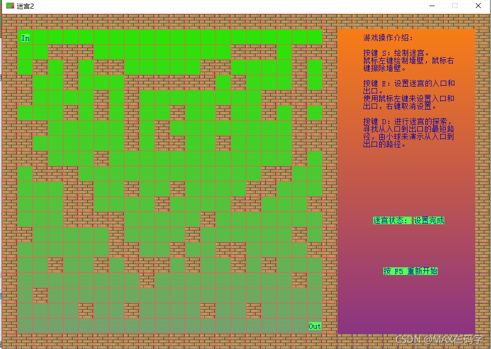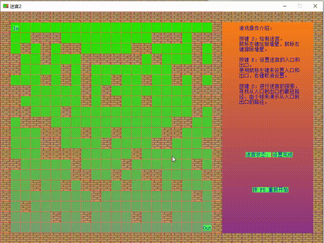 然后我们按下s键都就可以来绘制我们的迷宫了,可以随意绘制,这都是没有问题的,但别把路都堵死了