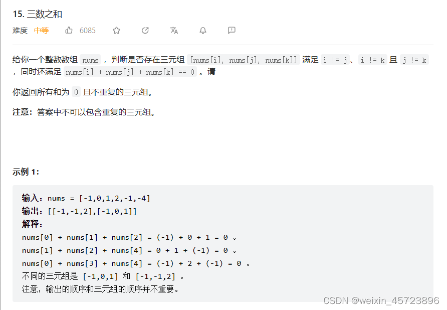 力扣-15-三数之和 将numbers[i],numbers[j],numbers[k]添加到要返回的列表。去重:判断numbers[j]=numbers[j+1],如果相等,跳过当前重复的值。判断numbers[k]=numbers[k-1],如果相等,跳过当前重复的值。判断numbers[i]+numbers[j]+numbers[k]=0。1、将numbers进行排序,然后先固定一个数numbers[i]2、再设置j=i+1,k=len(numbers)-1。如果和大于0,则k-1。如果和小于0,则j+1。