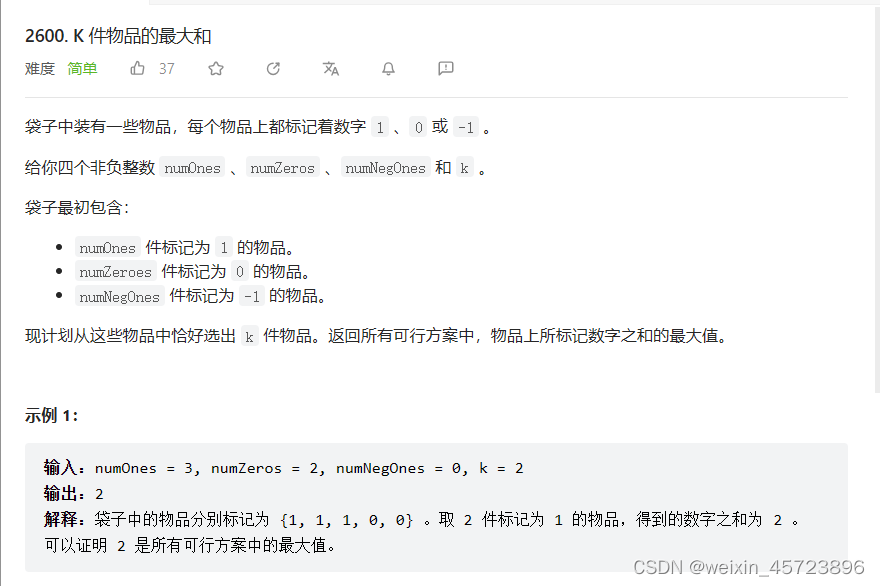 力扣-2600-k件物品最大和(python) 3、如果numZeros<k<=numNegOnes,则最多有numOnes个1,numZeros个0,k-numZeros-numOnes个-1,即为numOnes-(k-numZeros-numOnes)4、如果k>numNegOnes,则最多有numOnes个1,numNegOnes个-1,即为numOnes-numNegOnes。2、如果numOnes<k<=numZeros,则最多拿numOnes个值,即为numOnes。1、如果k<=numOnes,则最大值就是全拿第一个,即为k。