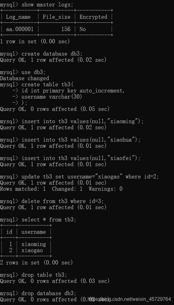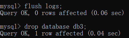 不用说,我们操作的命令肯定是记录在aa.000001文件里了,现在我们重新再新建一个日志吧,然后再把db3这个库给干掉,如下: