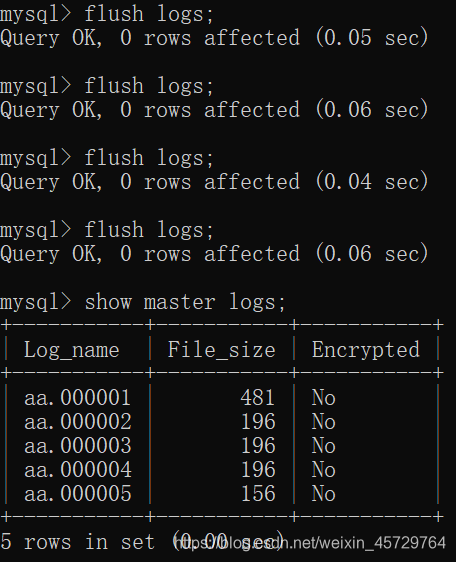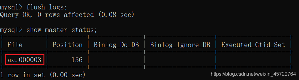 如果你再一次flush logs,表示结束当前日志,重开一个日志,上面也提到过了,我们再试一遍,如下: