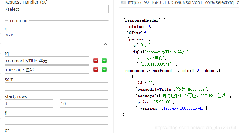 fq的另一个语法,表示并且的关系,比如commodityTitle:华为,苹果,表示要把commodityTitle中有华为的和有苹果的都查出来。同样也支持字段1:值1 AND/OR 字段2:值2。