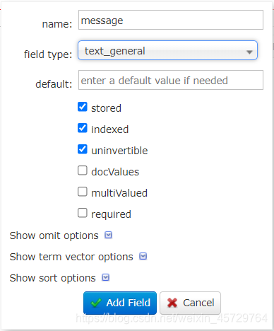 剩下的字段一样的操作,不过像id,price这两字段,Solr已经默认帮我们提供了(说白了就是managed-chema文件里已经存在了name等于id和name等于price的field标签),那我们就关注剩下的message咯,如下: