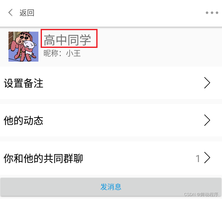 看图上红框框住的部分,是你为他设置的备注,括号括起来的是对方原本的昵称。当然,我们可以向小王随便发一个消息,如下: