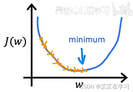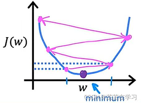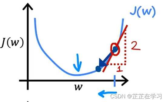 当选择一个w,w在最小值的右侧时,导数为正,学习率α是0-1的正数,因此每次梯度下降后,w必然减小。直至到达最小值时,导数