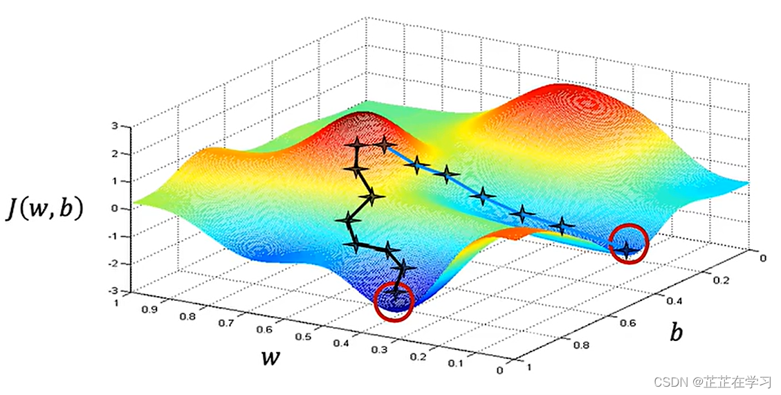 下图的某代价函数的三维图,可以视作山峰山谷。选取一个点(w,b),选择一个方向进行梯度下降,梯度下降的每一次更新,就迈向一个更低点,一直到达某个山谷,即局部最小值。