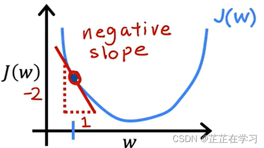 当选择一个w,w在最小值的左侧时,导数为负,学习率α是0-1的正数,因此每次梯度下降后,w必然变大。直至到达最小值时,导数