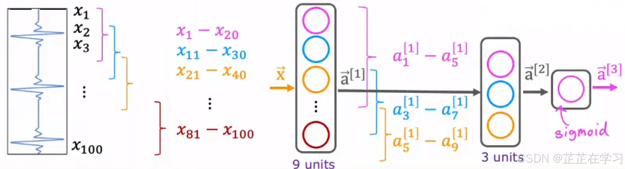 - 第一层隐藏层使用卷积层类型,第一个神经元的输入是x1到x20,第二个神经元的输入是x11到x30;