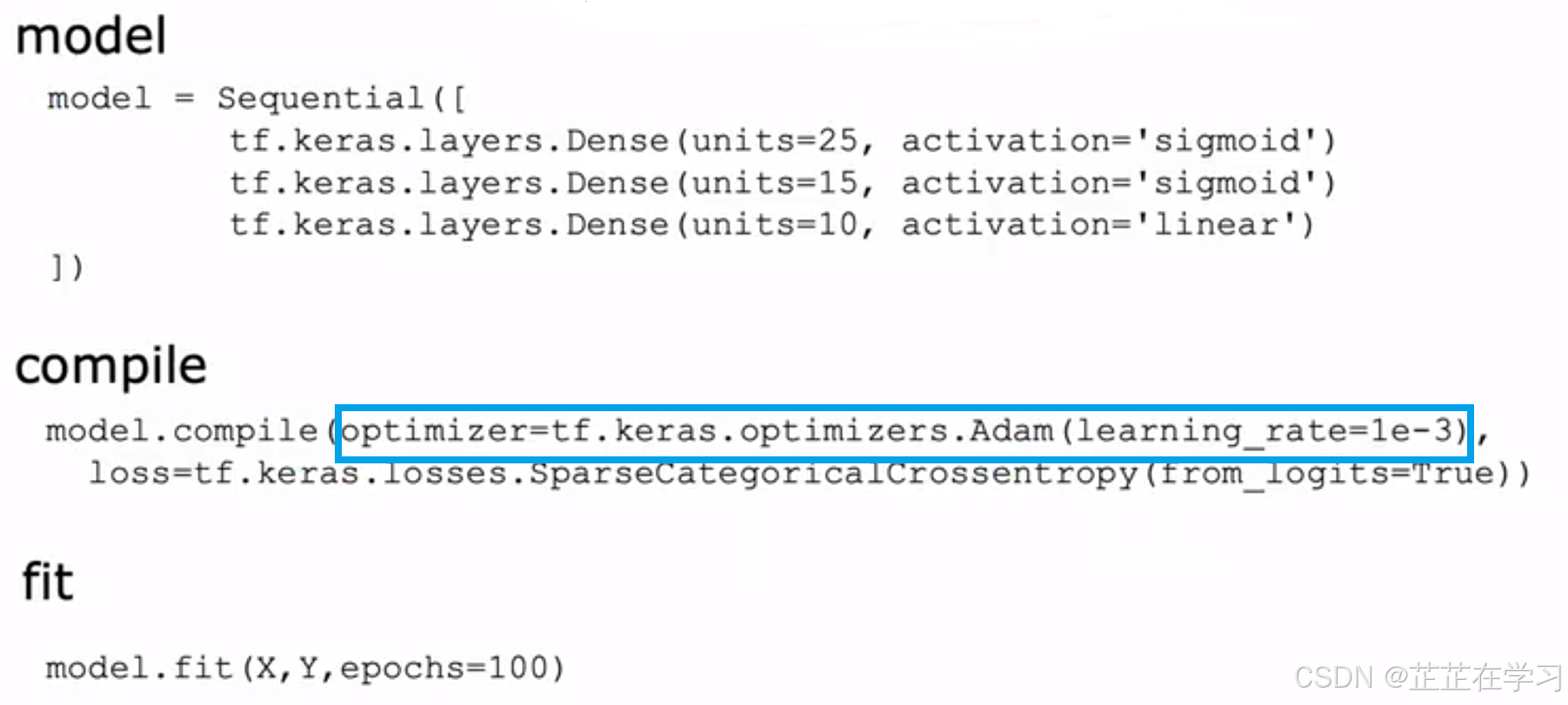 设置model.compile(optimizer=tf.keras.optimizers.Adam(learning rate=1e-3),使用Adam,需要设置初始学习率learning rate。