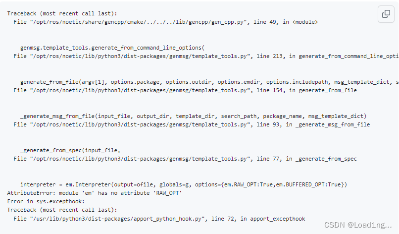 catkin_make lidar_align时报错解决 在catkin_make lidar_align文件时出现了traceback(most recent call back)的报错,后面还伴随着attributeError:module"em" has no attribute "RAW_OPT"的错误解决方法:在这里给出参考的链接。