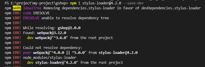 【无标题】 提示:这里描述项目中遇到的问题:vscode安装stylus-loader失败报错While resolving: gshop@1.0.0npm ERR! Found: webpack@3.12.0npm ERR! dev webpack@"^3.6.0" from the root projectnpm ERR!npm ERR! Could not resolve dependency:npm ERR! peer webpack@"^4.0.0 || ^5.0.0" from stylu