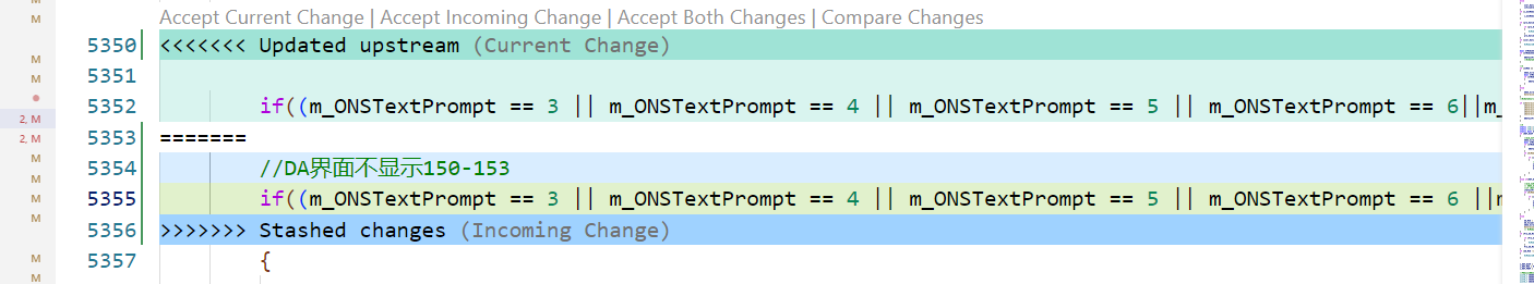因为在git stash 这一笔有对这段代码进行修改,然后git pull --rebase之后,又对这段代码修改了,git push了,之后又git pull --rebase,在git stash pop就出现上面的情况。2.手动将stashed changes部分删除,保留updated upstream部分。1.git checkout xxx.cpp,就会跟远程仓库一样,但是其他代码也会消去。