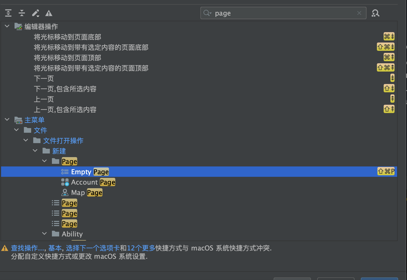 鸿蒙DevEco Studio系统及自定义快捷键 打开DevEco Studio的设置界面 → 选择快捷键 选项,搜索要操作的内容,例如搜索page,双击或者右键进行快捷键编辑,那么下次就可以快速创建page页了。