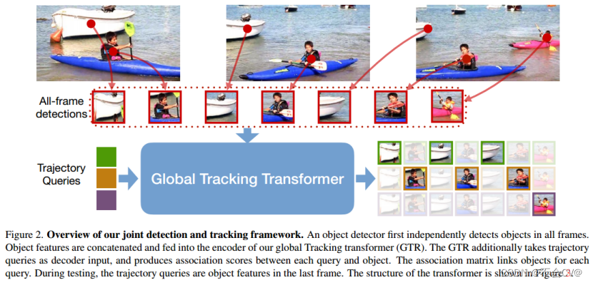 GTR对来自多个连续帧的检测进行编码,并使用轨迹查询将它们分组为轨迹。查询是在NMS后根据单个帧的目标的检测特征进行的,并由GTR转换为轨迹。每个轨迹查询通过使用softmax分布分配,使得每个帧的检测产生单个全局轨迹。因此,GTR的输出是检测结果及其在时间上的关联结果。