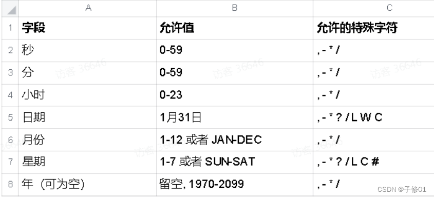 2.“?”:只能用在DayofMonth和DayofWeek两个域。它也匹配域的任意值,这两个域相互影响冲突,所以当其中一个域有具体值,另一个域就使用“?”,配合满足具有具体值的域的条件后再满足自身条件。